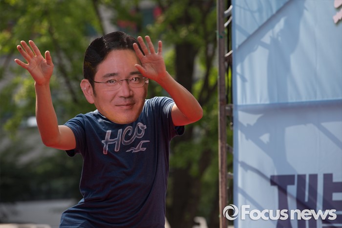 (서울=포커스뉴스) 금속노조 삼성전자서비스지회 조합원들이 22일 오후 서울 서초구 삼성 서초사옥 앞에서 열린 '재벌개혁 투쟁 결의대회'에 참석해 이재용 3대 세습을 비판하는 퍼포먼스를 펼치고 있다.