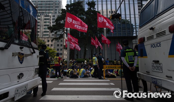 (서울=포커스뉴스) 금속노조 삼성전자서비스지회 조합원들이 22일 오후 서울 서초구 삼성 서초사옥 앞에서 열린 '재벌개혁 투쟁 결의대회'에 참석하고 있다.
