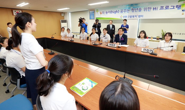 (인천=포커스뉴스) 이기권 고용노동부 장관이 22일 인천 고용복지+센터 방문, 고용센터에서 운영하는 고등학생 취업지원 프로그램에 모의면접관으로 참여하고 있다. <사진제공=고용노동부>