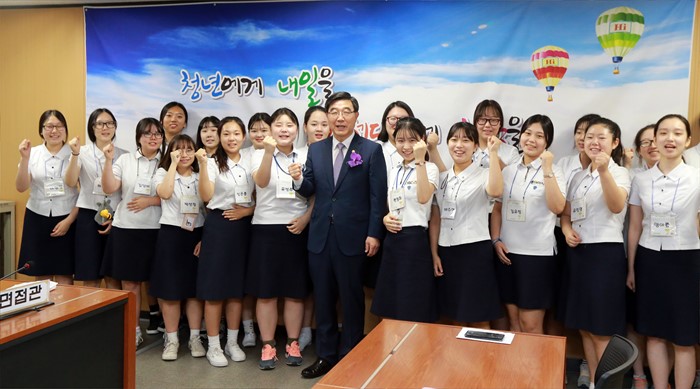 (인천=포커스뉴스) 이기권 고용노동부 장관이 22일 인천 고용복지+센터 방문, 고용센터에서 운영하는 고등학생 취업지원 프로그램에 모의면접관으로 참여하고 학생들과 기념촬영하고 있다. <사진제공=고용노동부>