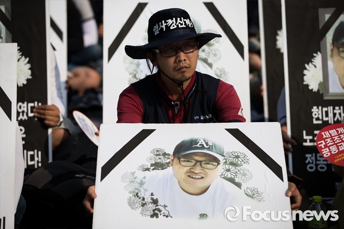 (서울=포커스뉴스) 정부의 일방적인 조선업 구조조정 중단과 현대차 그룹의 성실한 그룹사 공동교섭 참여, 정부의 노동개악 철회등을 내걸며 파업에 들어간 전국금속노조가 22일 오후 서울 서초구 현대자동차 본사 앞에서 금속노조 총파업 대회를 열고 있다.