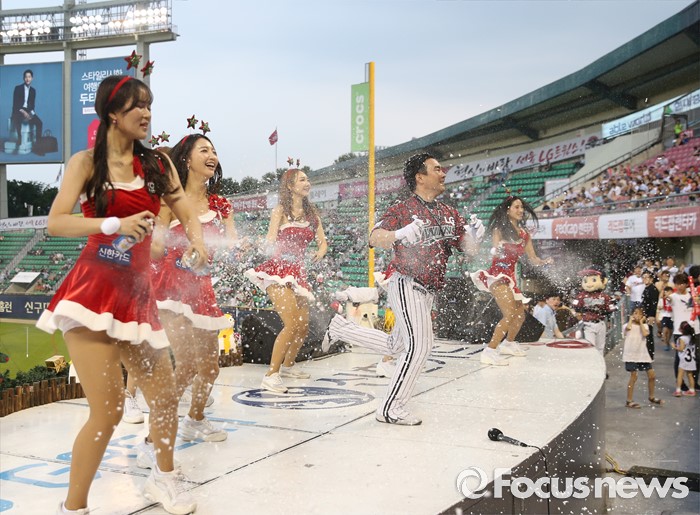(서울=포커스뉴스) 22일 서울 잠실구장에서 열린 2016 프로야구 두산-LG 경기에서 LG 치어리더가 '섬머 크리스마스' 주제에 맞춰 산타 복장으로 눈스프레이를 뿌리며 한 여름의 더위를 식혀주고 있다.