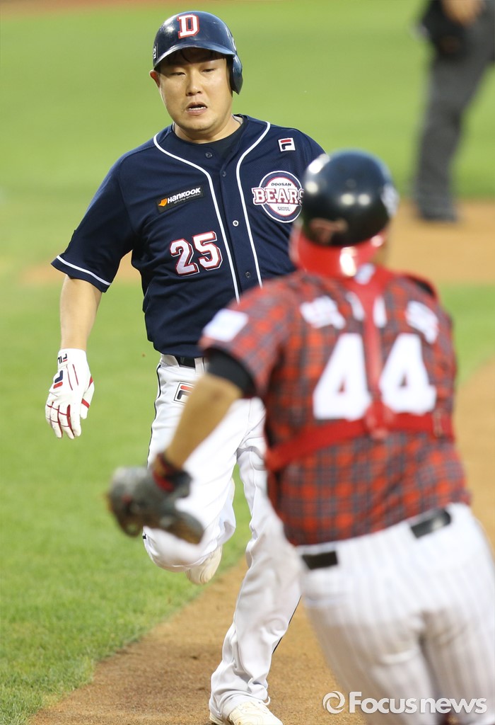 (서울=포커스뉴스) 22일 서울 잠실구장에서 열린 2016 프로야구 두산-LG 경기 4회초 1사 1루에서 두산 1루주자 양의지가 에반스의 좌중간 2루타때 홈으로 달려들고 있다.