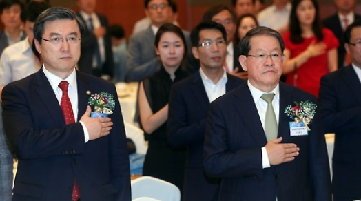 주영섭 중기청장은 "중견기업의 성장과 국가경제 발전에 크게 기여하고 있는 중견기업인들의 노고에 감사하다"며 "중견기업인들의 노력이 빛을 발할 수 있도록 기업환경 개선을 위해 법·제도를 지속 개선하고, 육성시책을 지속적으로 확대 추진할 것"이라고 밝혔다.주영섭 중기청장(왼쪽)과 강호갑 중견련 회장이 '제2회 중견기업인의 날' 기념식에서 국민 의례를 하고 있다.<사진제공=중견련>