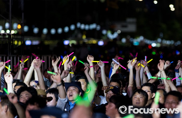 (서울=포커스뉴스) 22일 오후 서울 광화문광장에서 열린 2016 재벌개혁 시민한마당에서 전국금속노동조합(금속노조)이 율동공연을 보며 야광봉을 흔들고 있다.