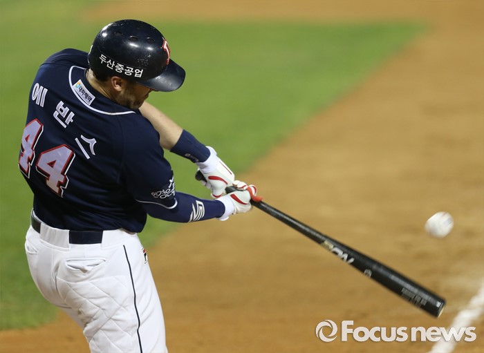 (서울=포커스뉴스) 22일 서울 잠실구장에서 열린 2016 프로야구 두산-LG 경기 7회초 무사 만루에서 두산 에반스가 2타점 좌중간 안타를 날리고 있다.