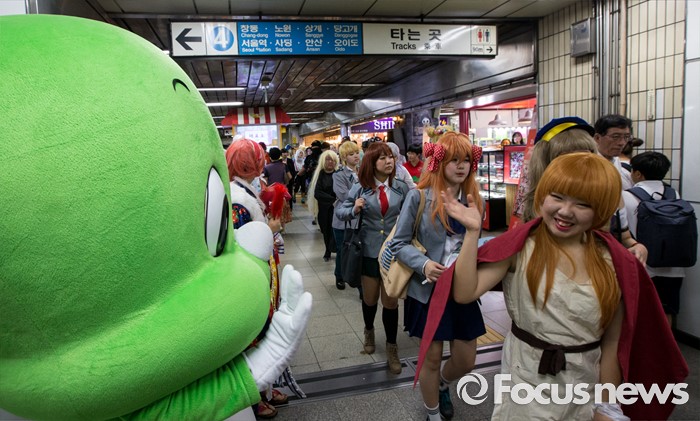 (서울=포커스뉴스) 23일 오전 서울 도봉구 쌍문역에서 코스프레를 한 학생들이 둘리와 인사하고 있다, 이날 쌍문동 둘리뮤지엄에서는 개관 1주년을 맞아'둘리네 집들이' 가 열렸다.