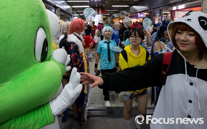 (서울=포커스뉴스) 23일 오전 서울 도봉구 쌍문역에서 코스프레를 한 학생들이 둘리와 인사하고 있다, 이날 쌍문동 둘리뮤지엄에서는 개관 1주년을 맞아'둘리네 집들이' 가 열렸다.