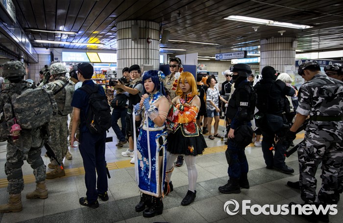 (서울=포커스뉴스) 23일 오전 서울 도봉구 쌍문역에서 코스프레를 한 학생들이 둘리뮤지엄 개관 1주년 기념행사 '둘리네 집들이' 퍼레이드를 기다리고 있다.