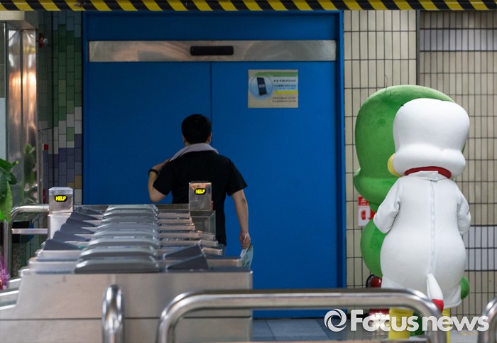 (서울=포커스뉴스) 23일 오전 서울 도봉구 쌍문역에서 둘리와 또치가 기념행사를 마친 후 지하철 개찰구를 통과하고 있다, 이날 쌍문동 둘리뮤지엄에서는 개관 1주년을 맞아'둘리네 집들이' 가 열렸다.