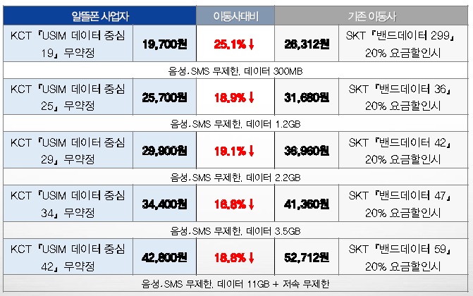 제 4이동통신 선정은 성급하게 재추진하지 않기로 방향을 정했다. 알뜰폰 활성화 진행상황, 신규 허가 수요의 변화 등 시장상황을 고려해 내년 초에 추진 여부를 재검토한다. 미래부는 “심사 결과 재정적 능력 미흡 등 자격 미달로 희망 사업자가 모두 탈락했고, 이후 수요에 특별한 변화가 없는 상황 등을 고려해 신중하게 선정하기로 했다”고 설명했다.알뜰폰 업체들의 데이터 중심 요금제 출시의 예시.<표제공=미래부>