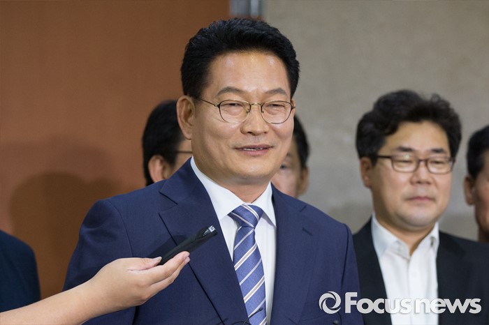 (서울=포커스뉴스) 송영길 더불어민주당 의원이 24일 오전 서울 여의도 국회 정론관에서 당대표 출마 기자회견을 마친 뒤 취재진 질문에 답하고 있다.
