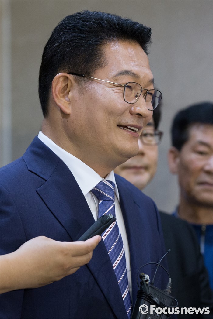 (서울=포커스뉴스) 송영길 더불어민주당 의원이 24일 오전 서울 여의도 국회 정론관에서 당대표 출마 기자회견을 마친 뒤 취재진 질문에 답하고 있다.