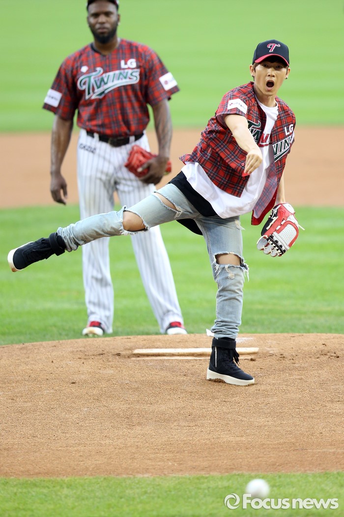 (서울=포커스뉴스) 24일 서울 잠실구장에서 열린 2016 프로야구 두산-LG 경기에 앞서 시구한 가수 장우혁이 그라운드에 패대기쳐진 볼을 바라보며 황당해 하고 있다.
