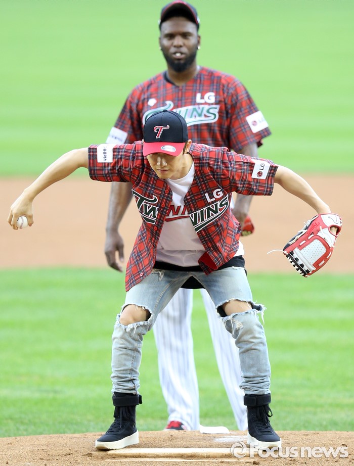 (서울=포커스뉴스) 24일 서울 잠실구장에서 열린 2016 프로야구 두산-LG 경기에 앞서 시구자롤 나온 가수 장우혁이 포수를 보며 세리머니를 하고 있다.