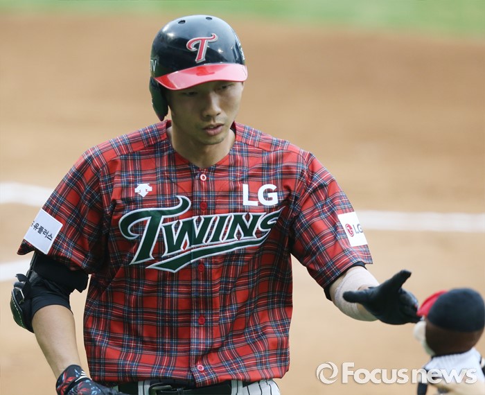 (서울=포커스뉴스) 24일 서울 잠실구장에서 열린 2016 프로야구 두산-LG 경기 1회말 LG 김용의가 1번타자로 나온 첫 경기 첫 타석에서 좌월 선제 솔로 홈런을 치고 홈인하며 홈런 인형을 받고 있다.
