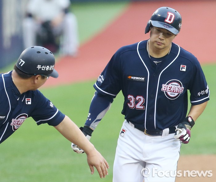 (서울=포커스뉴스) 24일 서울 잠실구장에서 열린 2016 프로야구 두산-LG 경기 2회초 두산 선두타자 김재환이 중월 솔로 홈런을 치고 3루를 돌며 전형도 코치의 축하를 받고 있다.