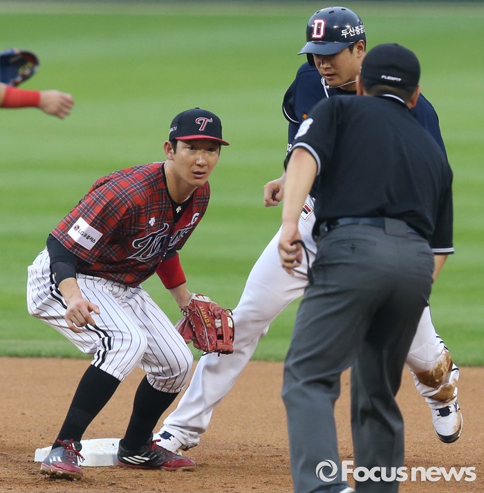 (서울=포커스뉴스) 24일 서울 잠실구장에서 열린 2016 프로야구 두산-LG 경기 3회초 2사 1루에서 두산 1루주자 김재환이 2루 도루를 시도하고 있다. LG 2루수 손주인이 2루심의 판정을 바라보고 있다. 합의판정에서 세이프로 확정.