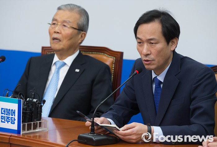 (서울=포커스뉴스) 우상호 더불어민주당 원내대표가 25일 오전 서울 여의도 국회에서 열린 비상대책위원회의에 참석해 모두발언을 하고 있다. 왼쪽은 김종인 비대위 대표.