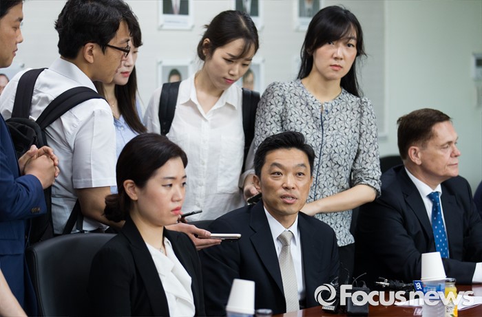 (인천=포커스뉴스) 정재균(가운데) 아우디폭스바겐 부사장이 25일 오전 인천 서구 국립환경과학원에서 열린 차량 인증 조작 관련 환경부 청문회에 참석해 취재진 질문에 답변하고 있다.