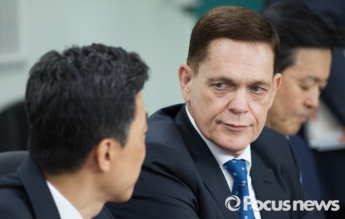 (인천=포커스뉴스) 요하네스 타머(가운데) 아우디폭스바겐 사장과 정재균 부사장이 25일 오전 인천 서구 국립환경과학원에서 열린 차량 인증 조작 관련 환경부 청문회에 참석해 대화 나누고 있다.