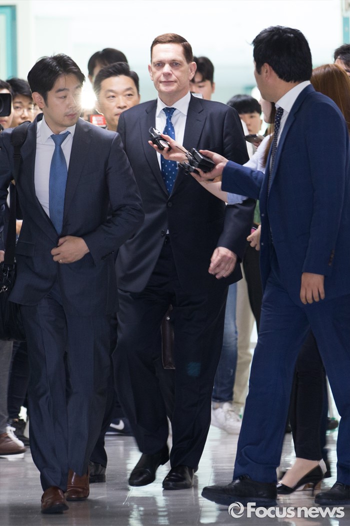 (인천=포커스뉴스) 요하네스 타머(가운데) 아우디폭스바겐 사장이 25일 오전 인천 서구 국립환경과학원에서 열린 차량 인증 조작 관련 환경부 청문회에 참석하고 있다.