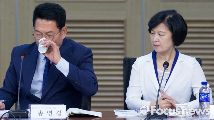 (서울=포커스뉴스) 25일 오전 서울 여의도 국회 의원회관에서 개성공단살리기 국회의원 모임 주최로 열린 개성공단 전면중단, 고도의 정치적 행위 논리 정당한가? 세미나에 전당대회 출마를 선언한 송영길(왼쪽) 더불어민주당 의원이 참석해 물을 마시고 있다. 오른쪽은 전대 출마를 선언한 추미애 의원.