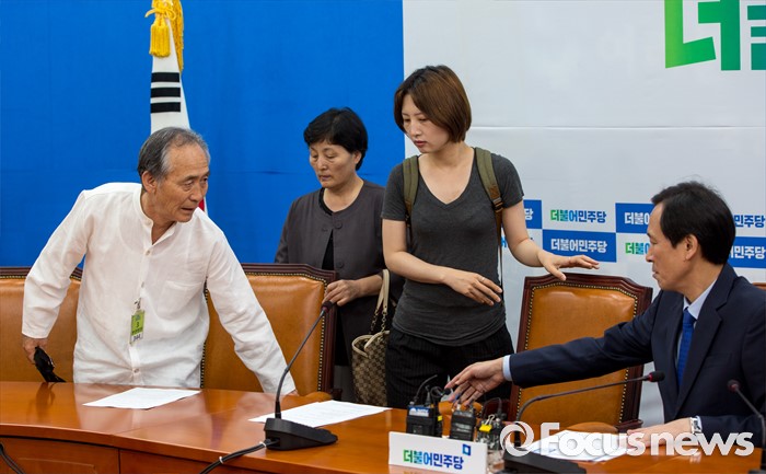 (서울=포커스뉴스) 백남기 농민 대책위원회 관계자 및 가족들이 25일 오전 서울 여의도 국회에서 열린 '더불어민주당-백남기 농민 대책위원회 면담'에 참석하기 위해 회의실로 들어서고 있다. 왼쪽부터 정현찬 카톨릭농민회 회장, 백남기 농민 부인 박경숙 씨, 딸 백도라지씨, 우상호 더불어민주당 원내대표.
