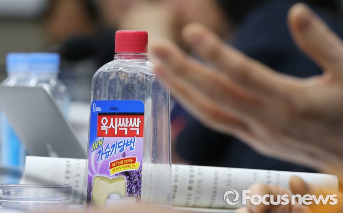 (세종=포커스뉴스) 25일 오전 세종시 정부세종청사 국회회의실에서 열린 환경부·고용노동부·국립환경과학원·안전보건공단에 대한 국회 가습기살균제 특조위 현장조사에서 옥시싹싹 제품이 보이고 있다.