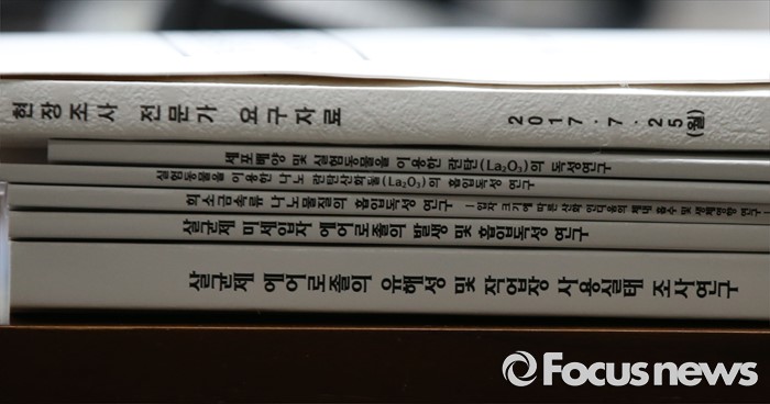 (세종=포커스뉴스) 25일 오전 세종시 정부세종청사 국회회의실에서 열린 환경부·고용노동부·국립환경과학원·안전보건공단에 대한 국회 가습기살균제 특조위 현장조사에서 조사자료가 책상에 올려져 있다.