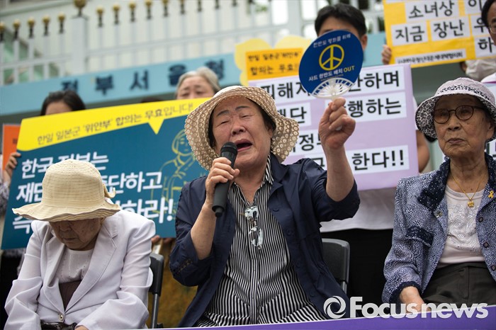 (서울=포커스뉴스) 25일 오전 서울 종로구 정부서울청사 앞에서 화해·치유재단 설립 강행하는 정부를 규탄하는 정대협(한국정신대문제대책협의회) 및 일본군 위안부 피해자 할머니들의 집회가 열리고 있다.