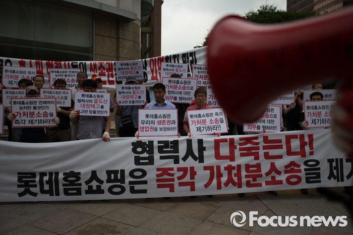 (서울=포커스뉴스) 25일 오전 서울 중구 롯데백화점 앞에서 롯데홈쇼핑 협력사 비상대책위원회원들이 생존권 보장을 촉구하며 집회를 열고 있다.