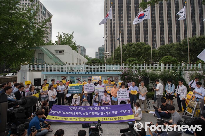 (서울=포커스뉴스) 25일 오전 서울 종로구 정부서울청사 앞에서 화해·치유재단 설립을 강행하는 정부를 규탄하는 정대협(한국정신대문제대책협의회) 및 일본군 위안부 피해자 할머니들의 집회가 열리고 있다.