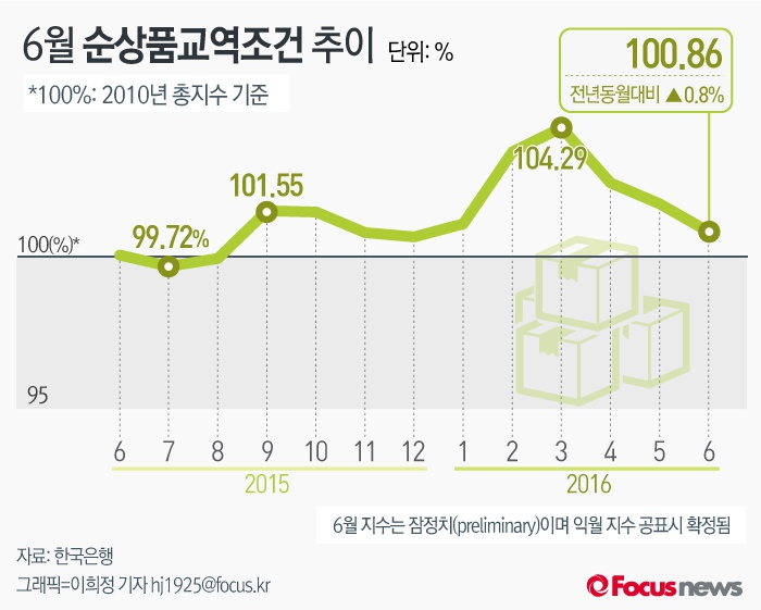 (서울=포커스뉴스) 25일 한국은행이 발표한 ‘6월 무역지수 및 교역조건'에 따르면 6월 순상품교역조건지수는 100.86로 전년 동월 대비 0.8% 상승했다.