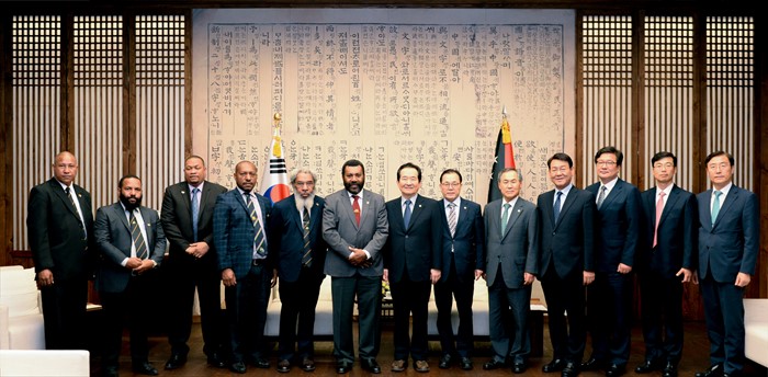 (서울=포커스뉴스) 정세균 국회의장 일행이 25일 오전 서울 여의도 국회 의장접견실에서 국회 공식 초청으로 한국을 방문한 티오도르 주레누옥(Theodore Zurenuoc, 가운데) 파푸아뉴기니 국회의장 일행을 접견, 기념촬영을 하고 있다. <사진제공=국회>