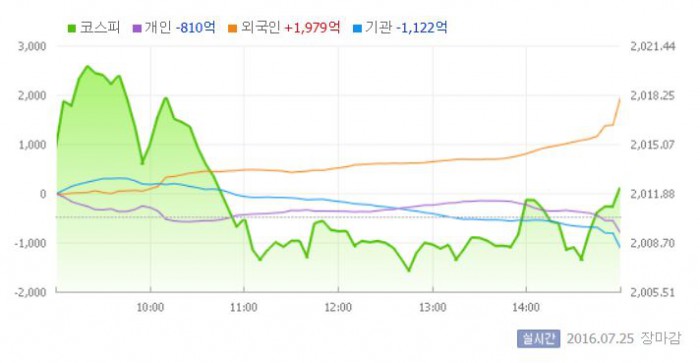 이날 코스피는 전거래일 대비 0.22% 상승한 2014.74로 장을 시작했다. 이후 지수는 외국인과 기관의 순매수에 상승폭을 확대했다. 장중 한때 2020선을 찍기도 했다. 하지만 최근 상승랠리에 대한 부담감과 기관의 매도 전환에 상승분을 반납했다.