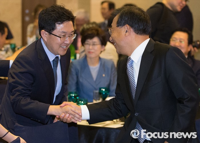(서울=포커스뉴스) 전당대회 대표최고위원 출마를 선언한 김용태(왼쪽), 이정현 새누리당 의원이 25일 오후 서울 여의도 중소기업중앙회관에서 열린 중앙위원회 전국시도당연합회 월례회 행사에 참석해 인사하고 있다.