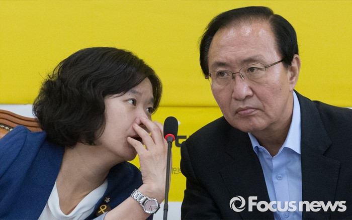 (서울=포커스뉴스) 26일 오전 서울 여의도 국회에서 열린 정의당 의원총회에 참석한 노회찬(오른쪽) 원내대표와 이정미 원내수석부대표가 대화하고 있다.