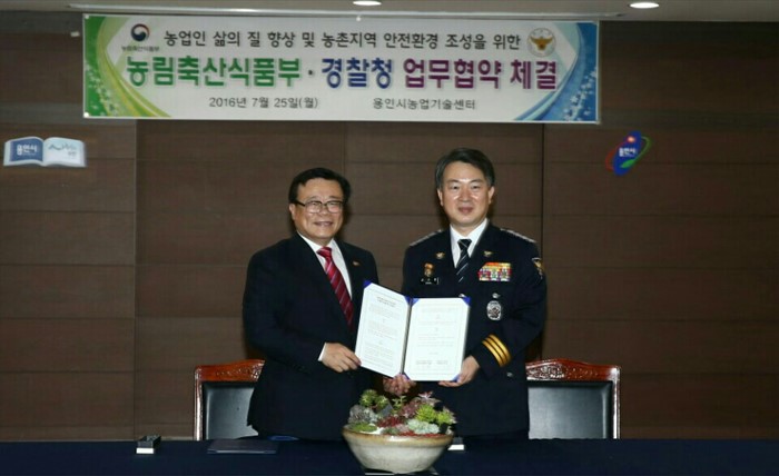 (용인=포커스뉴스) 이동필 농림축산식품부장관이 강신명 경찰청장과 25일 경기 용인시농업기술센터 임대사업소에서 농식품부-경찰청과 농촌지역 안전환경 조성 업무협약을 채결하고 있다. <사진제공=농림축산식품부>