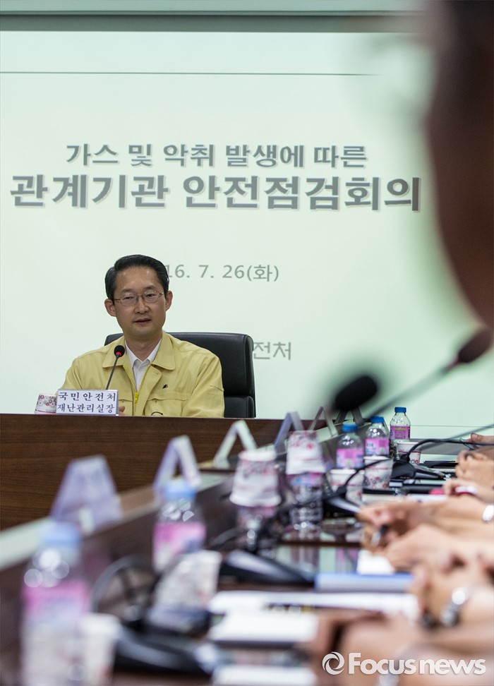 (서울=포커스뉴스) 26일 오전 정부서울청사에서 열린 가스 및 악취 발생 관계기관 안전점검회의에 참석한 김희겸 국민안전처 재난관리실장이 모두발언을 하고 있다.