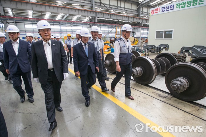 (고양=포커스뉴스) 김종인 더불어민주당 비대위 대표가 26일 오전 경기도 고양시에 위치한 수도권철도차량정비단을 방문, 정비기지를 둘러보고 있다.
