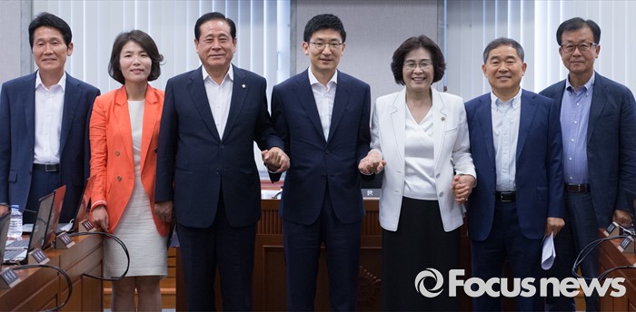(서울=포커스뉴스) 26일 오전 서울 여의도 국회에서 열린 정치발전특별위원회 전체회의에 참석한 김세연 위원장과 3당 간사 등 위원들이 함께 취재진을 향해 포즈를 취하고 있다. 왼쪽부터 윤소하 정의당 의원, 전희경 새누리당 의원, 배덕광 간사, 김 위원장, 유승희 더불어민주당 간사, 황주홍 국민의당 간사, 원혜영 더불어민주당 의원.
