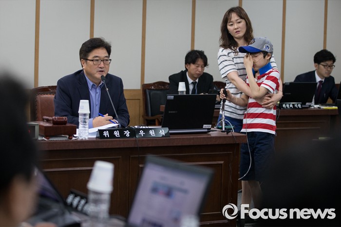 | △ 가습기 살균제 피해자 가족 소개하는 우원식 |