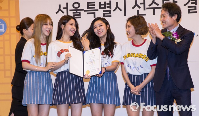 (서울=포커스뉴스) 26일 오전 서울 종로구 세종문화회관에서 열린 '2016 전국기능경기대회 서울특별시 선수단 결단식 및 홍보대사 위촉식'에 참석한 조희연(오른쪽) 서울시 교육감이 걸그룹 마마무를 향해 발수치고 있다.