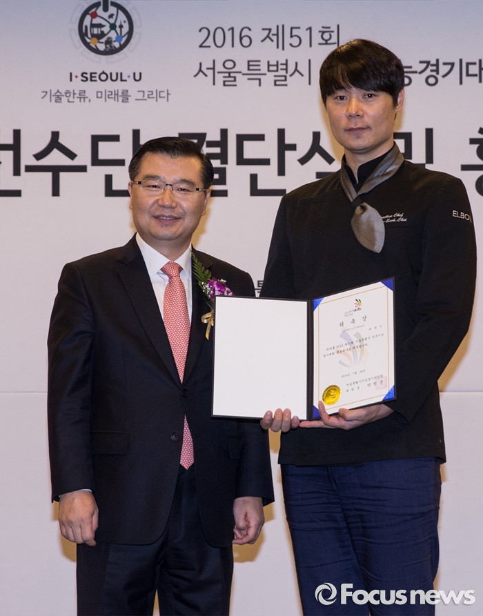 (서울=포커스뉴스) 26일 오전 서울 종로구 세종문화회관에서 열린 '2016 전국기능경기대회 서울특별시 선수단 결단식 및 홍보대사 위촉식'에 참석한 류경기(왼쪽) 서울시 행정1부시장과 요리사 최현석이 기념촬영을 하고 있다.