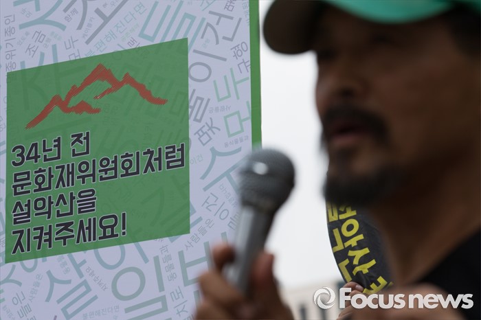 (서울=포커스뉴스) 26일 오전 서울 광화문광장에서 열린 설악산 케이블카 반대 기자회견에 참석한 설악산국립공원지키기 국민행동 회원들이 케이블카 취소 촉구 피켓을 들고 있다.