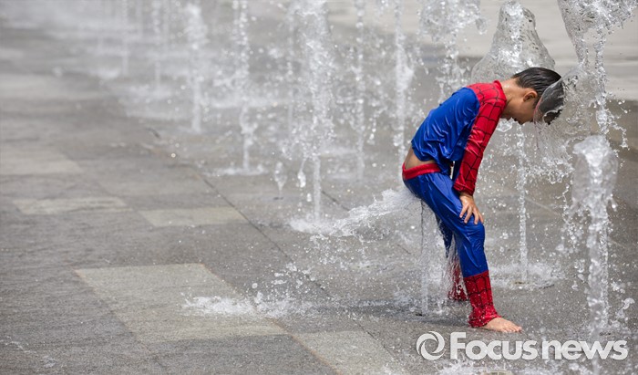 (서울=포커스뉴스) 무더위가 지속되고 있는 26일 오전 광화문광장 분수대에서 한 아이가 물놀이를 즐기고 있다.
