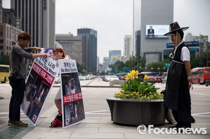 (서울=포커스뉴스) 26일 오전 서울 종로구 광화문광장에서 세이브 코리언 독스 회원(왼쪽)이 개고기 문화를 반대하는 피켓을 들고 있다.