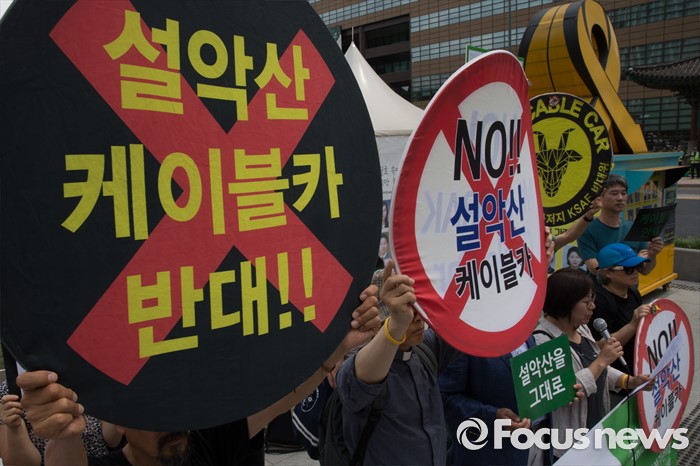(서울=포커스뉴스) 26일 오전 서울 광화문광장에서 열린 설악산 케이블카 반대 기자회견에 참석한 설악산국립공원지키기 국민행동 회원들이 케이블카 취소 촉구 피켓을 들고 있다.