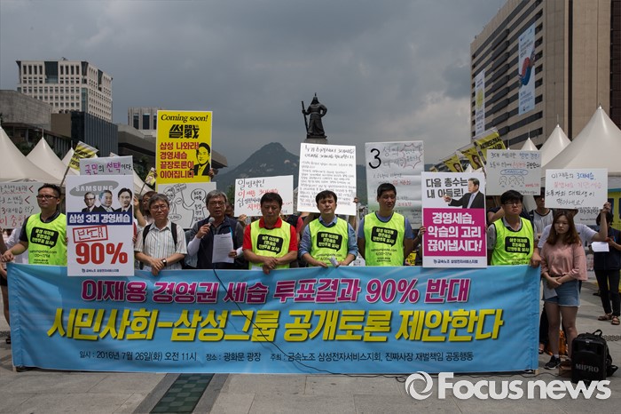 (서울=포커스뉴스) 26일 오전 서울 종로구 광화문광장에서 열린 삼성 경영권 세습 공개토론 제안 기자회견에 참석자들이 삼성의 경영세습을 규탄하고 있다.